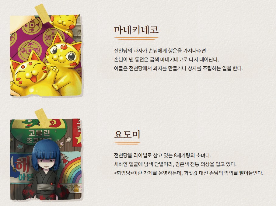 전천당은 소원을 들어주는 과자가게! 각 에피소드마다 다양한 인물이 등장하고 흥미진진한 사연이 소개된다. 전천장에서 팔고있는 과자 종류만 해도 엄청난듯! 실제 판매되면 재미있겠다!