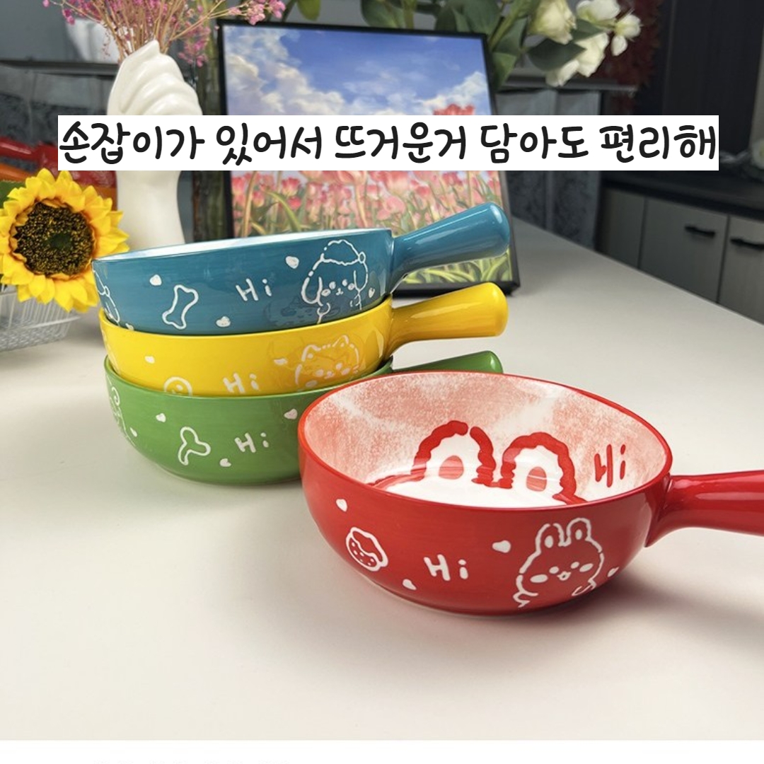 손잡이가 있는 그릇입니다. 보관하기도 편리하고 전자렌지나 오븐 등에서도 편리하게 사용할 수 있어요