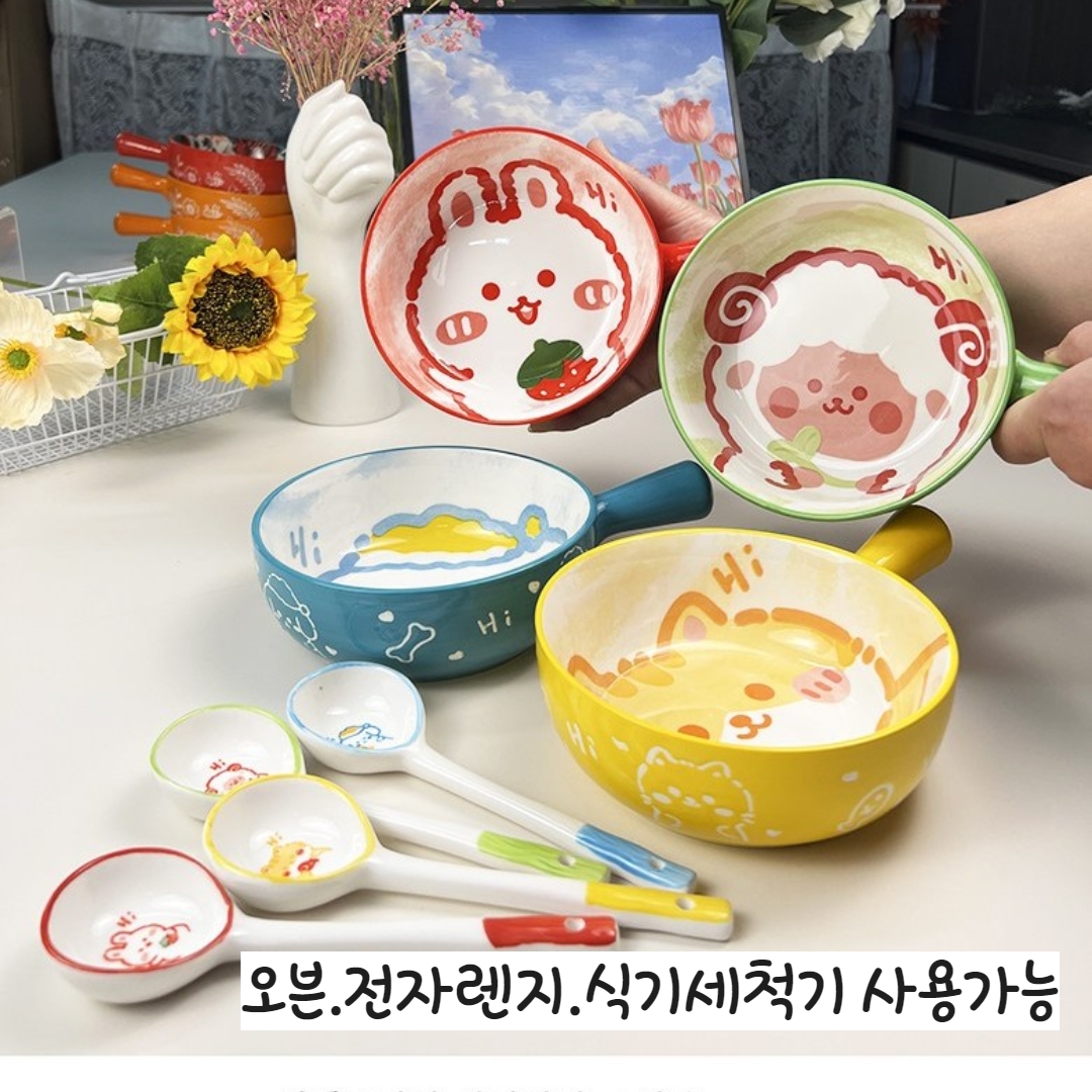 그릇과 숟가락을 함께 구매할 수 있는 제품으로 마찬가지로 손잡이가 있어서 뜨거운 거 담고 이동할때도 편리해요!
