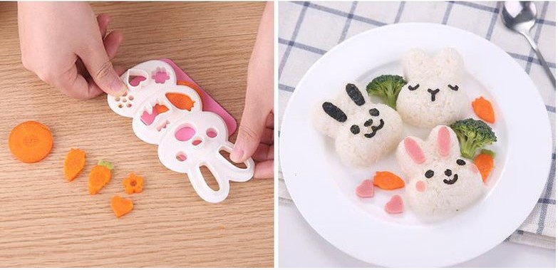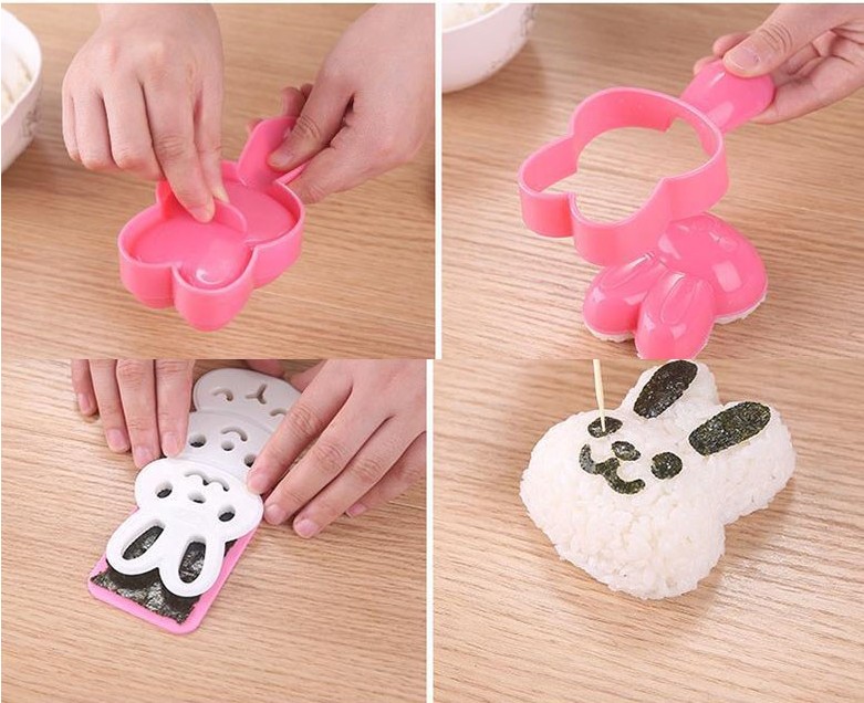 이럴때는 도구의 도움을 받아보시는 것도 좋은 방법이랍니다! 너무너무 귀엽게 도시락을 준비할 수 있는 토끼 주먹밥 틀입니다. 밥을 틀에 넣고 토끼모양을 만들어 낸다음 귀와 얼굴 표정을 김으로 포인트 해주면 완성! 참 쉽죠잉!