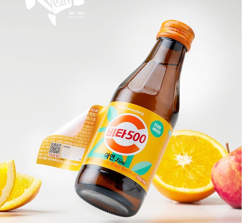 비타500 상큼한 느낌의 자양강장제 입니다! 아연이 포함되어 있다고 강조하고 있어요! MZ세대를 타겟하여 젊은 이미지로 광고하고 있는 비타500 입니다!